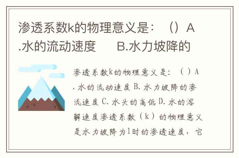 渗透系数k的物理意义是:()A.水的流动速度 B.水力坡降的渗流速度 C.水头的高低 D.水的溶解速度