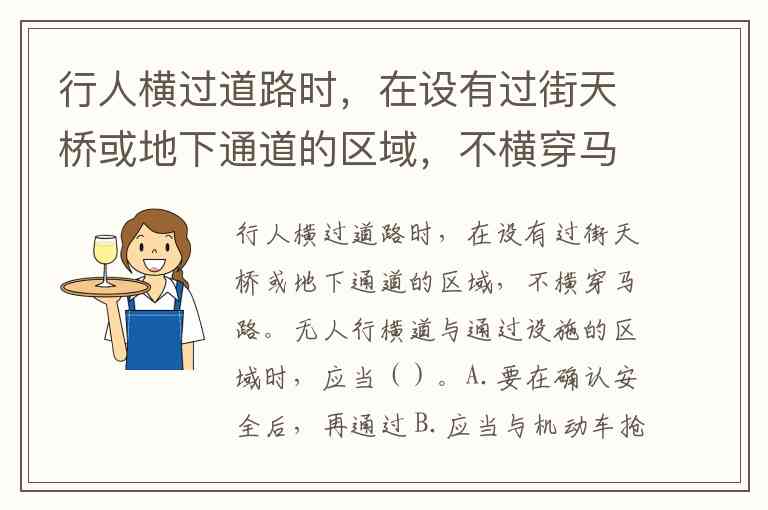 行人横过道路时,在设有过街天桥或地下通道的区域,不横穿马路。无人行横道与通过设施的区域时,应当()。A.要在确认安全后,再通过 B.应当与机动车抢过,因为车应当避让行人 C.要快速跑过 D.应当汇聚成团时集体通过
