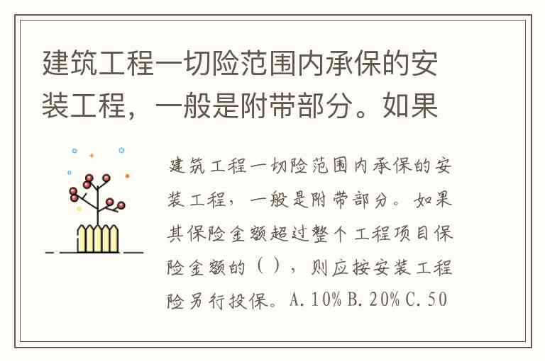 建筑工程一切险范围内承保的安装工程,一般是附带部分。如果其保险金额超过整个工程项目保险金额的(),则应按安装工程险另行投保。A.10% B.20% C.50% D.80%