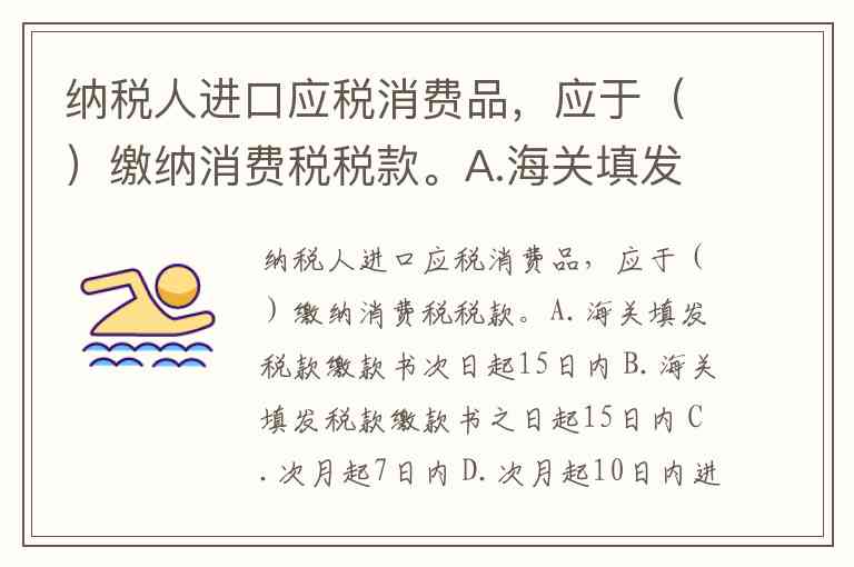 纳税人进口应税消费品,应于()缴纳消费税税款。A.海关填发税款缴款书次日起15日内 B.海关填发税款缴款书之日起15日内 C.次月起7日内 D.次月起10日内