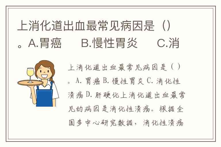 上消化道出血最常见病因是()。A.胃癌 B.慢性胃炎 C.消化性溃疡 D.肝硬化