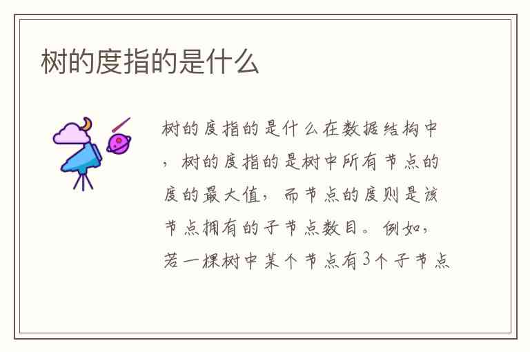 在数据结构中,树的度指的是树中所有节点的度的最大值,而节点的度则是该节点拥有的子节点数目。例如,若一棵树中某个节点有3个子节点,其他所有节点的子节点数都不超过3,那么这棵树的度就是3。