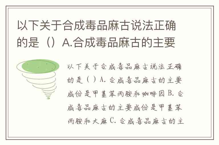 以下关于合成毒品麻古说法正确的是()A.合成毒品麻古的主要成份是甲基苯丙胺和咖啡因 B.合成毒品麻古的主要成份是甲基苯丙胺和大麻 C.合成毒品麻古的主要成份是甲基苯丙胺和可卡因