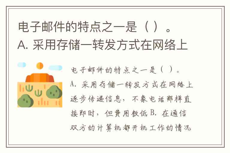 电子邮件的特点之一是( )。 A. 采用存储一转发方式在网络上逐步传递信息,不象电话那样直接即时,但费用教低 B. 在通信双方的计算机都开机工作的情况下方可快速传递数字信息 C. 比邮政信函电报电话传真都更快 D. 只要在通信双方的计算机之间建立起直接的通信线路后,便可快速传递数字信息。