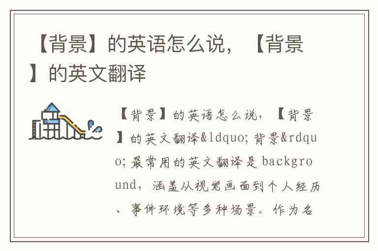 “背景”最常用的英文翻译是 background,涵盖从视觉画面到个人经历、事件环境等多种场景。作为名词,它既可以表示图片中的“后景”、事物的“底色”,也能指人的“出身背景”或事件的“背景情况”。例如:
