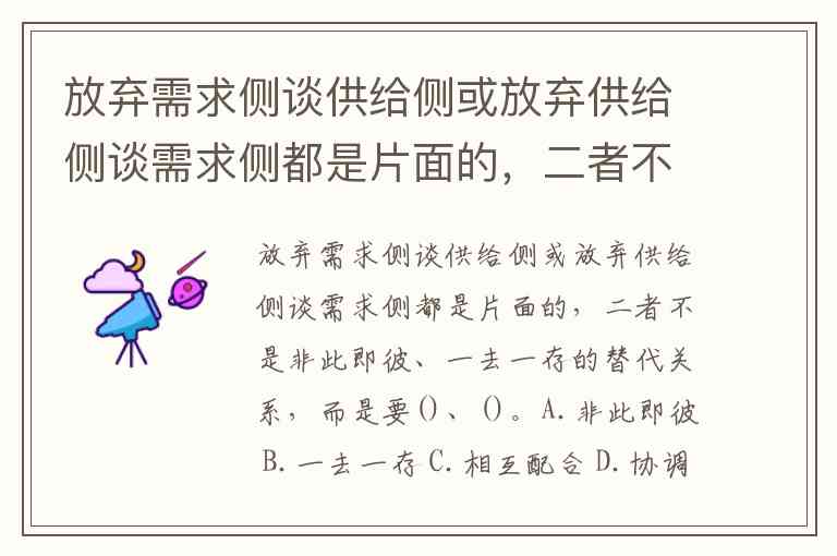 放弃需求侧谈供给侧或放弃供给侧谈需求侧都是片面的,二者不是非此即彼、一去一存的替代关系,而是要()、()。A.非此即彼 B.一去一存 C.相互配合 D.协调推进