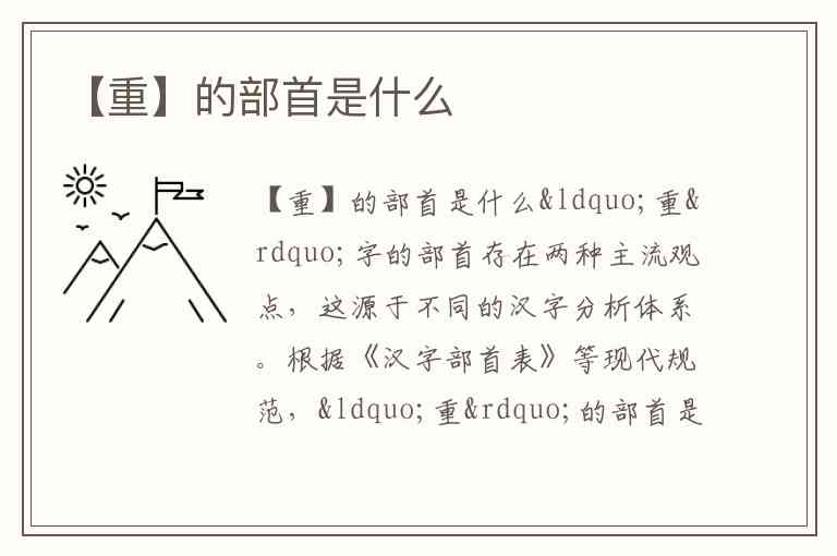 “重”字的部首存在两种主流观点,这源于不同的汉字分析体系。根据《汉字部首表》等现代规范,“重”的部首是“里”,这类观点认为其字形结构从“里”,体现了构字逻辑上的归类需求。而另一些资料将其部首标注为“丿”(撇字旁),这种划分更多基于汉字首笔检索的实用性,常见于部分字典的辅助检索系统。