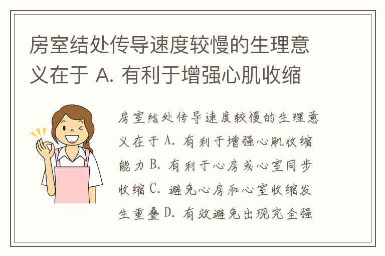房室结处传导速度较慢的生理意义在于 A. 有利于增强心肌收缩能力 B. 有利于心房或心室同步收缩 C. 避免心房和心室收缩发生重叠 D. 有效避免出现完全强直收缩
