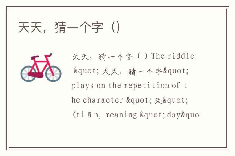 The riddle "天天,猜一个字" plays on the repetition of the character "天" (tiān, meaning "day"). In Chinese character construction, repeating a character often forms a new one with related meaning. Here, "天天" (two days) is visually represented by stacking two "日" (rì, also meaning "day") characters vertically, creating the character "昌" (chāng). Though "天" and "日" have distinct meanings, they both denote time-related concepts, making this a clever substituti