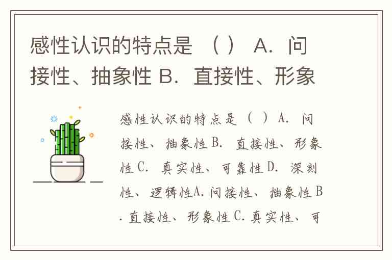 感性认识的特点是 ( ) A.问接性、抽象性 B.直接性、形象性 C.真实性、可靠性 D.深刻性、逻辑性A.问接性、抽象性 B.直接性、形象性 C.真实性、可靠性 D.深刻性、逻辑性