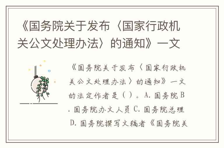 《国务院关于发布〈国家行政机关公文处理办法〉的通知》一文的法定作者是()。A.国务院 B.国务院办文人员 C.国务院总理 D.国务院撰写文稿者