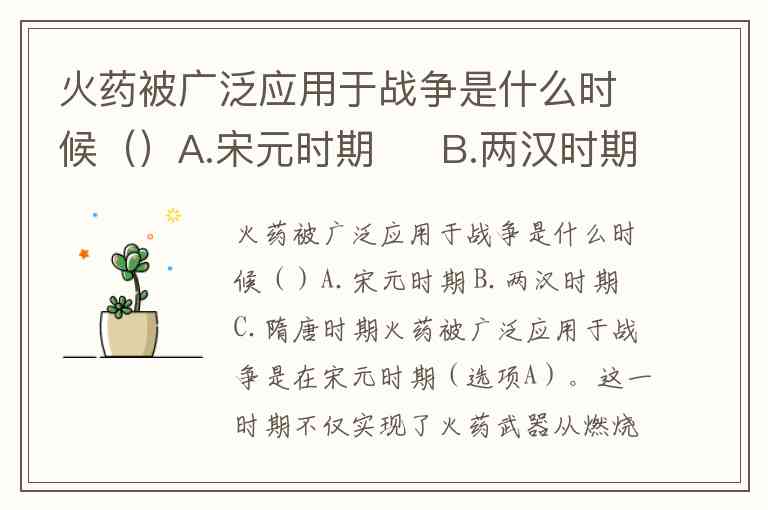 火药被广泛应用于战争是什么时候()A.宋元时期 B.两汉时期 C.隋唐时期
