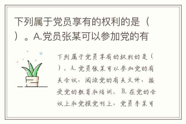 下列属于党员享有的权利的是()。A.党员张某可以参加党的有关会议,阅读党的有关文件,接受党的教育和培训。 B.在党的会议上和党报党刊上,党员李某可以参加关于党的政策问题的讨论。 C.党员陈某对党的工作可以提出建议和倡议。 D.在党组织讨论决定对党员赵某的党纪处分或作出鉴定时,赵某有权参加和进行申辩,其他党员可以为赵某作证和辩护。