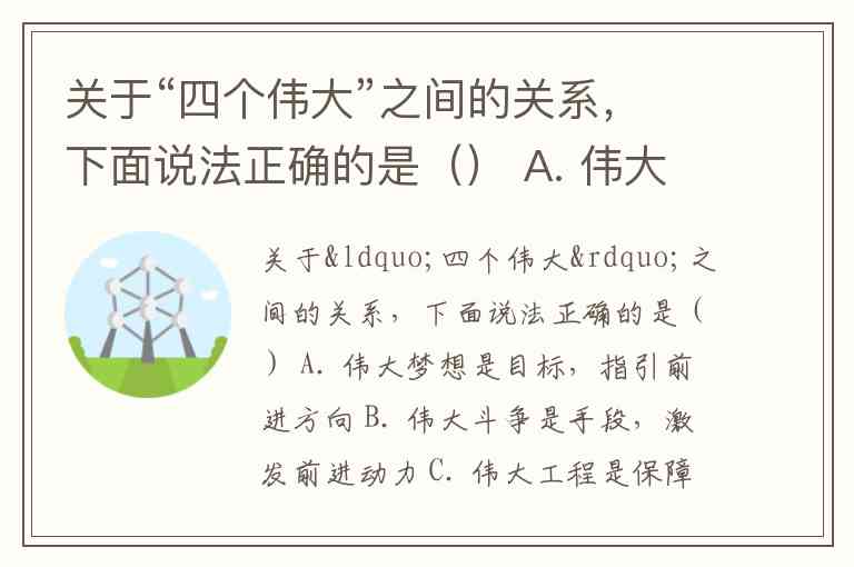 关于“四个伟大”之间的关系,下面说法正确的是() A. 伟大梦想是目标,指引前进方向 B. 伟大斗争是手段,激发前进动力 C. 伟大工程是保障,提供前进保证 D. 伟大事业是主题,开辟前进道路