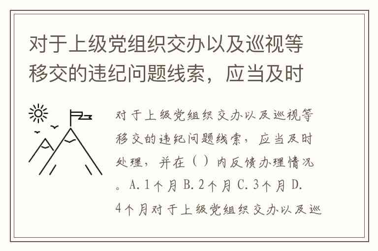 对于上级党组织交办以及巡视等移交的违纪问题线索,应当及时处理,并在()内反馈办理情况。A.1个月 B.2个月 C.3个月 D.4个月