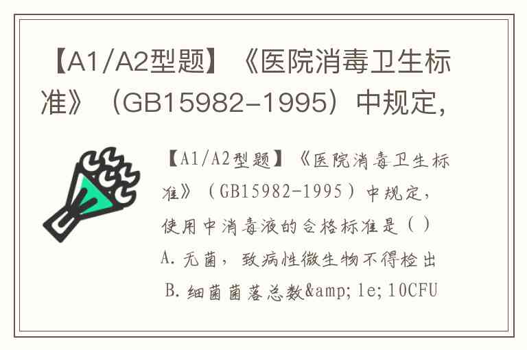 【A1/A2型题】《医院消毒卫生标准》(GB15982-1995)中规定,使用中消毒液的合格标准是()A.无菌,致病性微生物不得检出 B.细菌菌落总数≤10CFU/ml,致病性微生物不得检出 C.细菌菌落总数≤20CFU/ml,致病性微生物不得检出 D.细菌菌落总数≤100CFU/ml,致病性微生物不得检出 E.细菌菌落总数≤200CFU/ml,致病性微生物不得检出