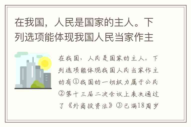 在我国,人民是国家的主人。下列选项能体现我国人民当家作主的有①我国的一切权力属于公民②第十三届二次会议上表决通过了《外商投资法》③已满18周岁的小马到街道投票站,参加所在选区的选举④第十三届二次会议上,代表们审议通过了国务院总理所作的政府工作报告() A. ①②③ B. ①③④ C. ②③④ D. ①②③④