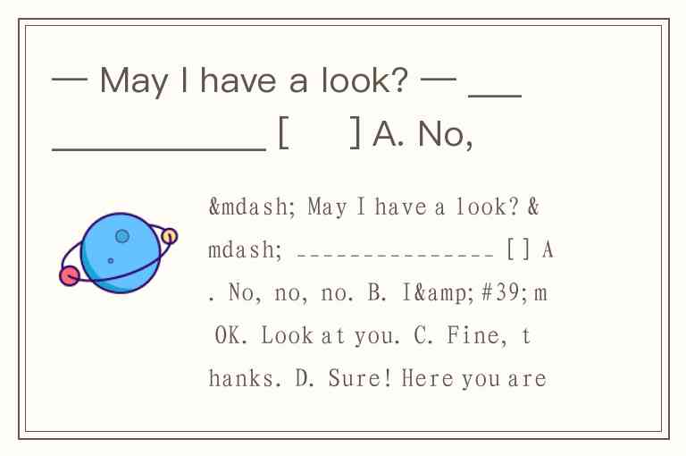 — May I have a look? — _______________ [ ] A. No, no, no. B. I'm OK. Look at you. C. Fine, thanks. D. Sure! Here you are.