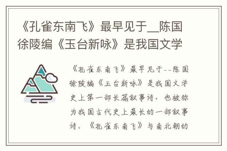 《孔雀东南飞》最早见于__陈国徐陵编《玉台新咏》是我国文学史上第一部长篇叙事诗,也被称为我国古代史上最长的一部叙事诗。《孔雀东南飞》与南北朝的《木兰诗》并称“乐府双璧”及“叙事诗双璧”。