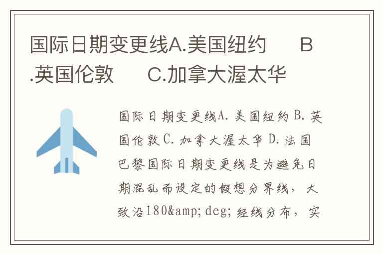 国际日期变更线A.美国纽约 B.英国伦敦 C.加拿大渥太华 D.法国巴黎