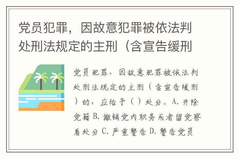 党员犯罪,因故意犯罪被依法判处刑法规定的主刑(含宣告缓刑)的,应给予()处分。A.开除党籍 B.撤销党内职务或者留党察看处分 C.严重警告 D.警告