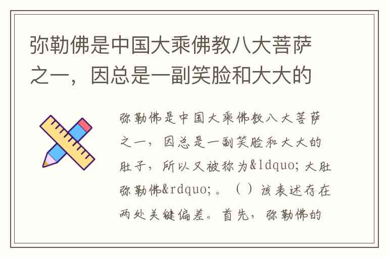弥勒佛是中国大乘佛教八大菩萨之一,因总是一副笑脸和大大的肚子,所以又被称为“大肚弥勒佛”。()