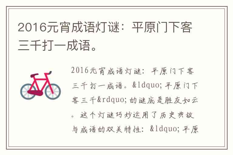2016元宵成语灯谜:平原门下客三千打一成语。