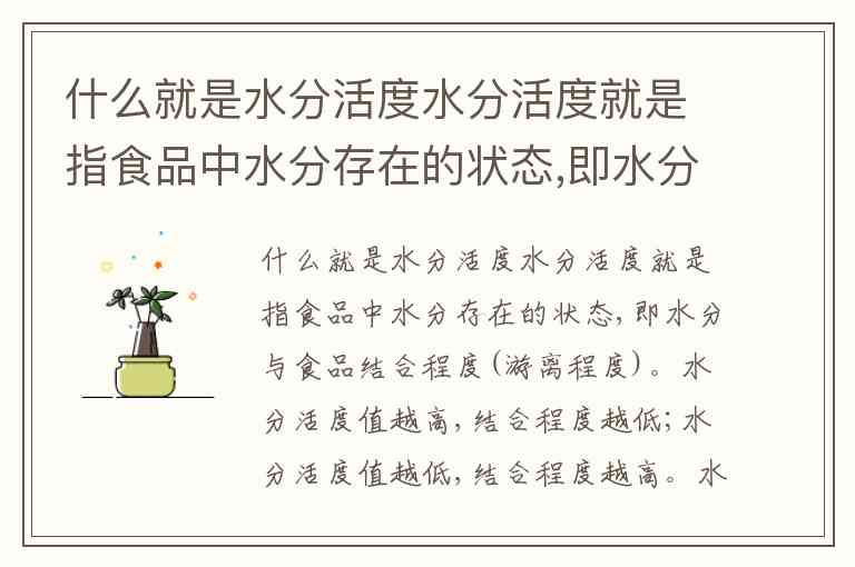 什么就是水分活度水分活度就是指食品中水分存在的状态,即水分与食品结合程度(游离程度)。水分活度值越高,结合程度越低;水分活度值越低,结合程度越高。水分活度数值用Aw表示的,水分活度值等于用百分率表示的相对湿度,其数值在0-1之间。溶液中水的蒸气分压P与纯水__Q的比值,Aw=P/Q。