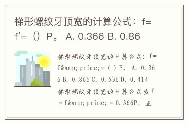 梯形螺纹牙顶宽的计算公式:f=f′=()P。 A. 0.366 B. 0.866 C. 0.536 D. 0.414