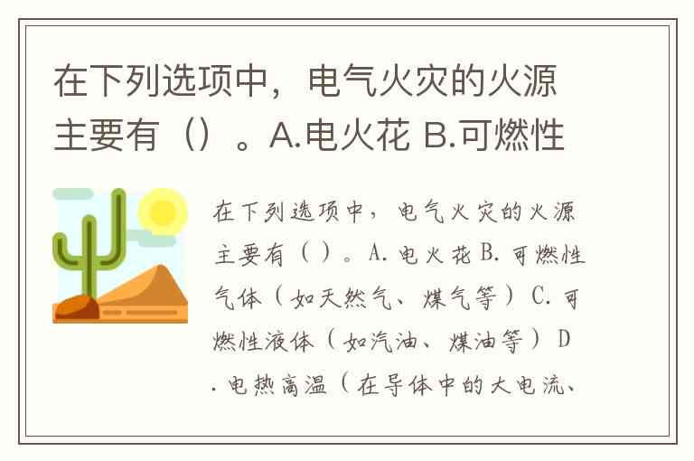 综上,电气火灾的主要火源为 A. 电火花、D. 电热高温 和 E. 电热器短路。日常生活中,定期检查线路绝缘、避免超负荷用电、规范使用电热器具,是防范这些火源的关键。你是否遇到过电器异常发热或火花的情况?当时是如何处理的?