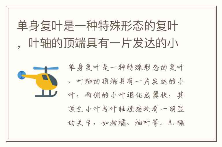 单身复叶是一种特殊形态的复叶,叶轴的顶端具有一片发达的小叶,两侧的小叶退化成翼状,其顶生小叶与叶轴连接处有一明显的关节,如柑橘、柚叶等。A.辐射脉 B.二叉脉序 C.羽状网脉 D.横出平行脉