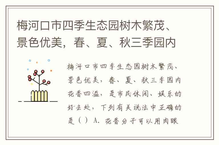 在梅河口市四季生态园闻到花香的现象,本质上是分子运动的宏观表现。分子是构成物质的基本微粒,直径约为1纳米左右,远小于肉眼可见的范围(通常需借助电子显微镜才能观察),因此选项A错误。市民能闻到花香,是因为花分泌的芳香油分子通过扩散现象在空气中做无规则运动,与分子间斥力无关——分子间斥力主要体现在压缩固体/液体时的阻力,如“水很难被压缩”才是斥力的表现,故选项B错误。