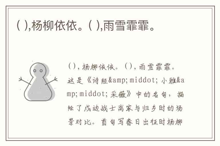 这是《诗经·小雅·采薇》中的名句,描绘了戍边战士离家与归乡时的场景对比。首句写春日出征时杨柳轻柔摇曳的景象,末句则刻画冬日归来时雨雪纷飞的凄凉,以景物变化衬托时间流逝与心境变迁。
