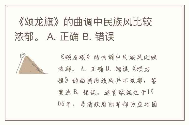 《颂龙旗》的曲调民族风并不浓郁,答案选 B. 错误。这首歌诞生于1906年,是清政府陆军部为应对国际交往需求而创作的代国歌,其旋律直接沿用了《北洋海军军歌》和《李中堂乐》。根据史料记载,《李中堂乐》实为李鸿章1896年出访时临时改编的作品,采用的是安徽庐剧曲调——一种地方戏曲旋律,而非典型的传统民族音乐元素。