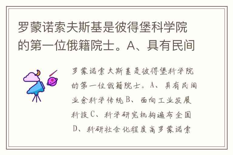 罗蒙诺索夫斯基是彼得堡科学院的第一位俄籍院士。A、具有民间业余科学传统 B、面向工业发展科技 C、科学研究机构遍布全国 D、科研社会化程度高