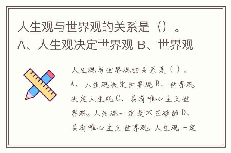 人生观与世界观的关系是()。A、人生观决定世界观 B、世界观决定人生观 C、具有唯心主义世界观,人生观一定是不正确的 D、具有唯心主义世界观,人生观一定是正确的