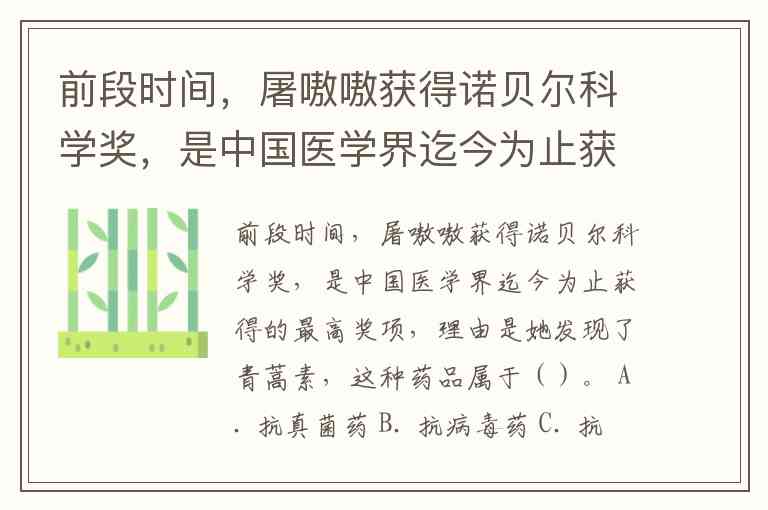 前段时间,屠嗷嗷获得诺贝尔科学奖,是中国医学界迄今为止获得的最高奖项,理由是她发现了青蒿素,这种药品属于()。 A. 抗真菌药 B. 抗病毒药 C. 抗恶性肿瘤药 D. 抗疟药