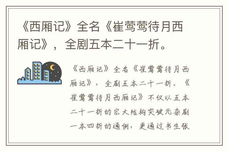 《西厢记》全名《崔莺莺待月西厢记》,全剧五本二十一折。