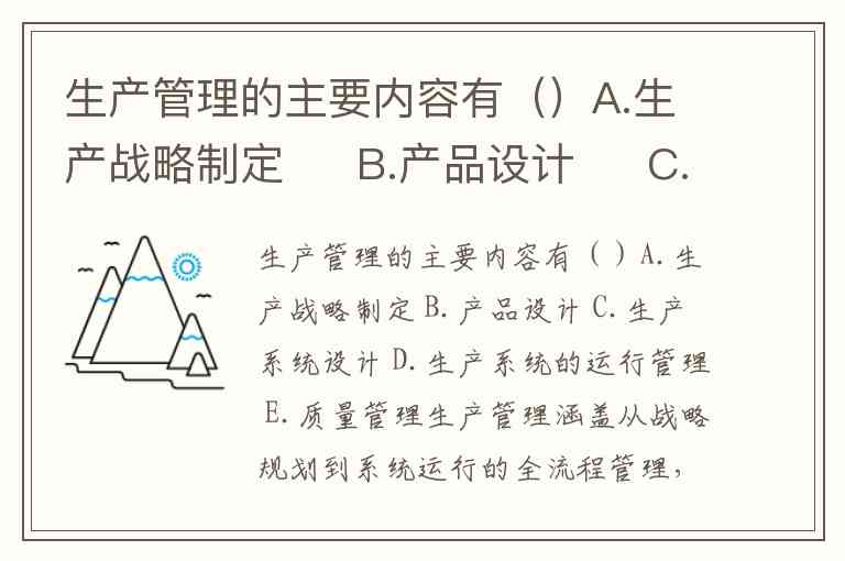 生产管理涵盖从战略规划到系统运行的全流程管理,核心内容包括生产战略制定、生产系统设计、生产系统运行管理三大模块,同时质量管理作为控制环节贯穿其中。根据管理职能划分,其主要内容对应选项中的A.生产战略制定、C.生产系统设计、D.生产系统的运行管理、E.质量管理,而产品设计通常属于研发范畴,不在生产管理核心内容之列。