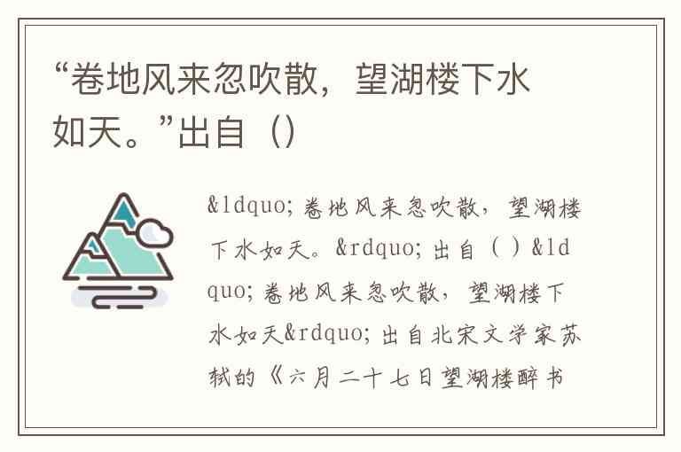 “卷地风来忽吹散,望湖楼下水如天”出自北宋文学家苏轼的《六月二十七日望湖楼醉书》。这首诗是苏轼谪居杭州期间创作的组诗之一,共有五首,以第一首最为著名。诗中描绘了夏日西湖骤雨来去的奇景,前两句“黑云翻墨未遮山,白雨跳珠乱入船”写出乌云骤聚、雨点飞溅的动态,后两句则以“卷地风”突然吹散雨雾,展现望湖楼下水天一色的开阔画面,将天气变化之迅速与湖光山色之壮美浓缩于二十八字中。