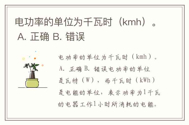 电功率的单位为千瓦时(kmh)。 A. 正确 B. 错误