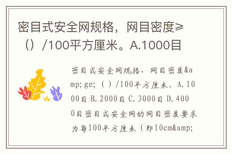 密目式安全网的网目密度要求为每100平方厘米(即10cm×10cm面积)不低于2000目,正确答案是 B.2000目。这一标准源于国家标准《安全网》GB5725-2009,该规范明确规定密目式安全立网需满足这一密度要求,以确保其能有效阻挡坠落物体和防止人员坠落。