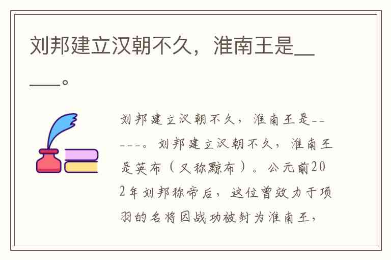 刘邦建立汉朝不久,淮南王是英布(又称黥布)。公元前202年刘邦称帝后,这位曾效力于项羽的名将因战功被封为淮南王,定都六县(今安徽六安),辖九江、庐江、衡山、豫章四郡,成为汉初八大异姓诸侯王之一。作为与韩信、彭越齐名的"汉初三大名将",英布的封国疆域辽阔,是刘邦稳定南方的重要力量。