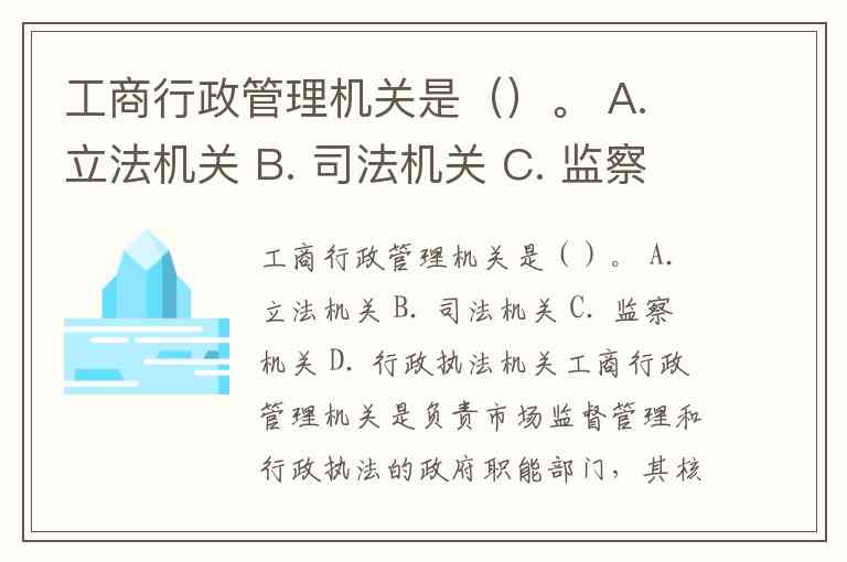 工商行政管理机关是()。 A. 立法机关 B. 司法机关 C. 监察机关 D. 行政执法机关