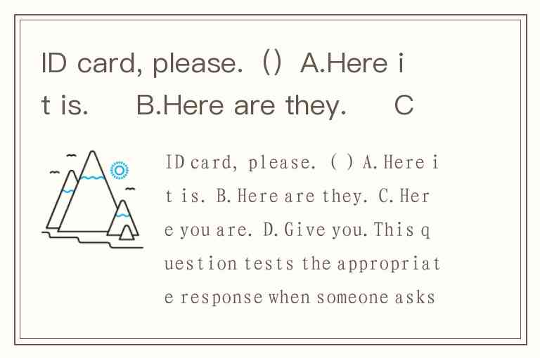 ID card, please.()A.Here it is. B.Here are they. C.Here you are. D.Give you.