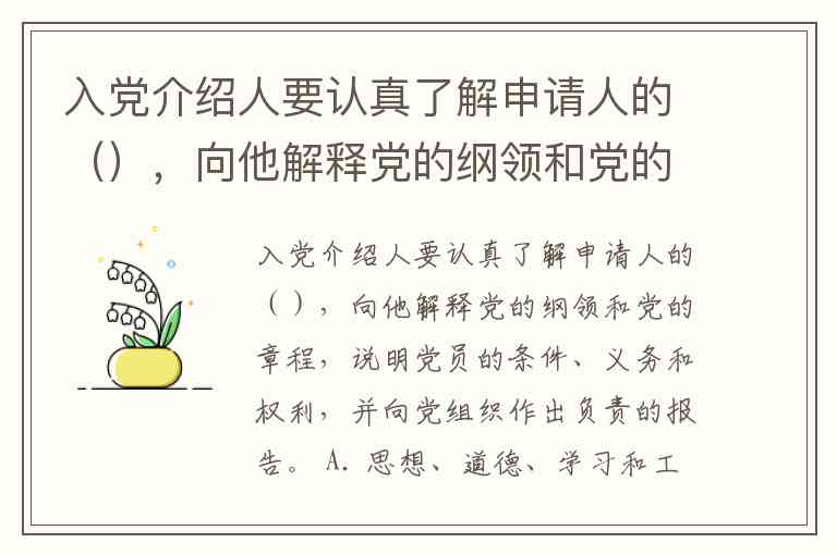 入党介绍人要认真了解申请人的(),向他解释党的纲领和党的章程,说明党员的条件、义务和权利,并向党组织作出负责的报告。 A. 思想、道德、学习和工作表现 B. 思想、品质、经历和工作表现 C. 思想、品德、历史和工作表现