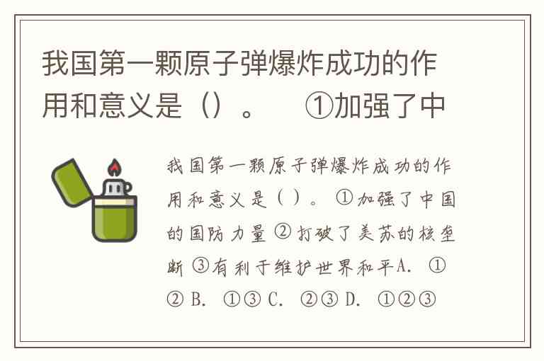 我国第一颗原子弹爆炸成功的作用和意义是()。 ①加强了中国的国防力量 ②打破了美苏的核垄断 ③有利于维护世界和平A.①② B.①③ C.②③ D.①②③
