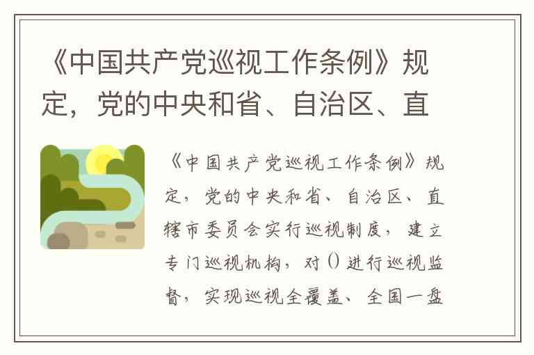 《中国共产党巡视工作条例》第六条明确规定,党的中央和省、自治区、直辖市委员会设立巡视机构,在一届任期内对所管理的地方、部门、企事业单位党组织实现巡视全覆盖。这一表述准确概括了巡视监督的对象范围,既体现了"党要管党、全面从严治党"的要求,也为"全国一盘棋"的巡视格局提供了制度依据。