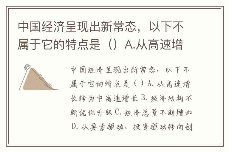 中国经济呈现出新常态,以下不属于它的特点是()A.从高速增长转为中高速增长 B.经济结构不断优化升级 C.经济总量不断增加 D.从要素驱动、投资驱动转向创新驱动