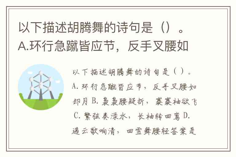 以下描述胡腾舞的诗句是()。A.环行急蹴皆应节,反手叉腰如却月 B.袅袅腰疑折,褰褰袖欲飞 C.繁弦奏渌水,长袖转回鸾 D.遏云歌响清,回雪舞腰轻